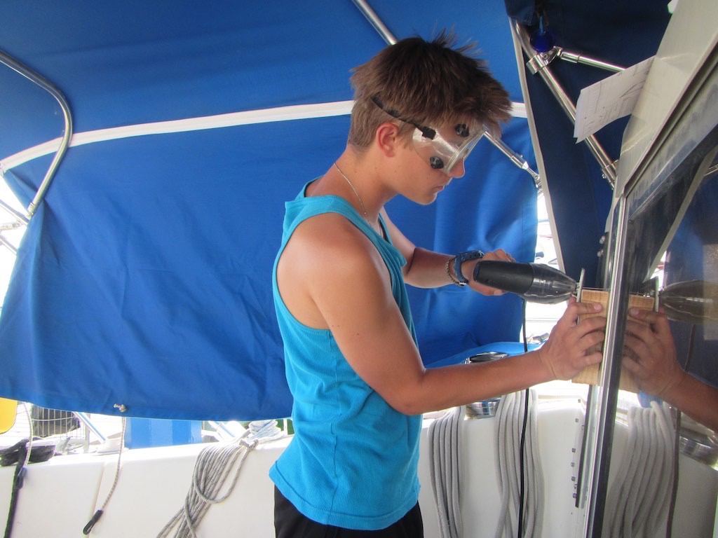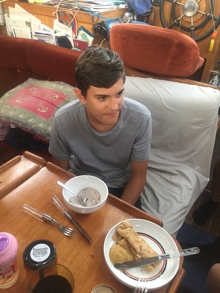 Ein Kaffee, wir brauchen einen Kaffee. Setzten uns in die nächste Beiz und lassen und nieder. Geschafft! Wir sind da. Trotz des etwas kurrligen Wetters sind wir ohne Problem hier in Lagos angekommen. Aber es gibt auch schon wieder Arbeit. Die Grauwasserpumpe hat schon seit ein paar Tagen gespukt, nun geht gar nichts mehr. Sämi und Sile unterstützen mich und so ist der Täter rasch gefunden. Metallspäne! Was? Wie kommen den die da hin? Die Pumpe hat überhaupt nichts abbekommen, geschweige denn Späne verloren. Komisch. Alles wieder zu und, läuft nicht. Der Deckel ist zu fest angezogen. Nochmal. Dann läuft sie einwandfrei. Zeit für’s legendäre Znacht. Sämi und Sile zaubern wieder einmal Omeletten. Sile raspelt Zimt für den Zucker und Sämi haut den Teig in die Pfanne. Lecker, Super lecker.