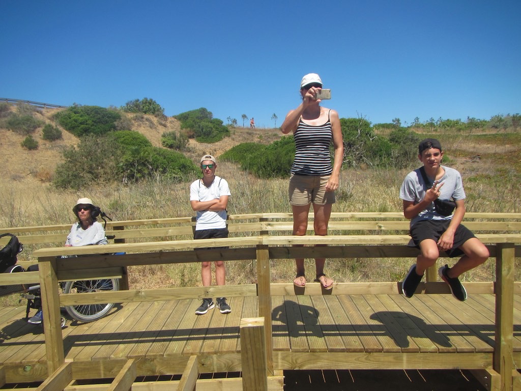 Spaziergang zum Leuchtturm von Ponta da Piedade. Alle sind dabei, denn Weg kennen wir mittlerweile und so finden wir auch die Abkürzung für den Weg hinten rum. Die Stege sind schon fast fertig. Für den Stuhl einfach einmalig, ohne Probleme da nach vorn zu kommen.