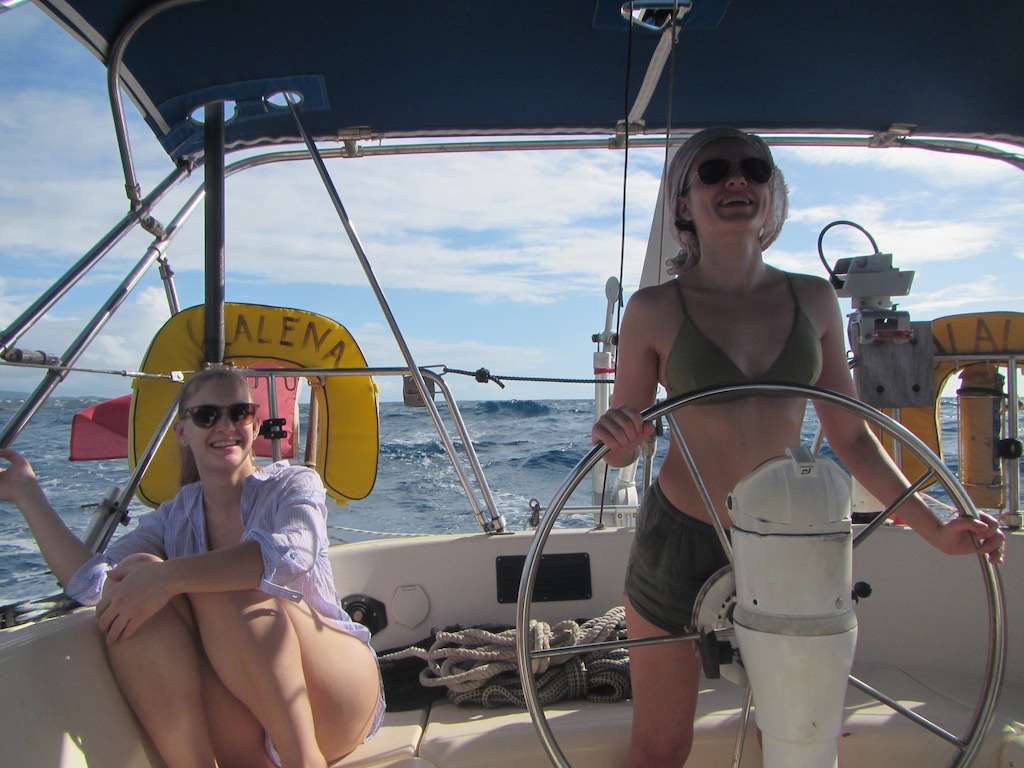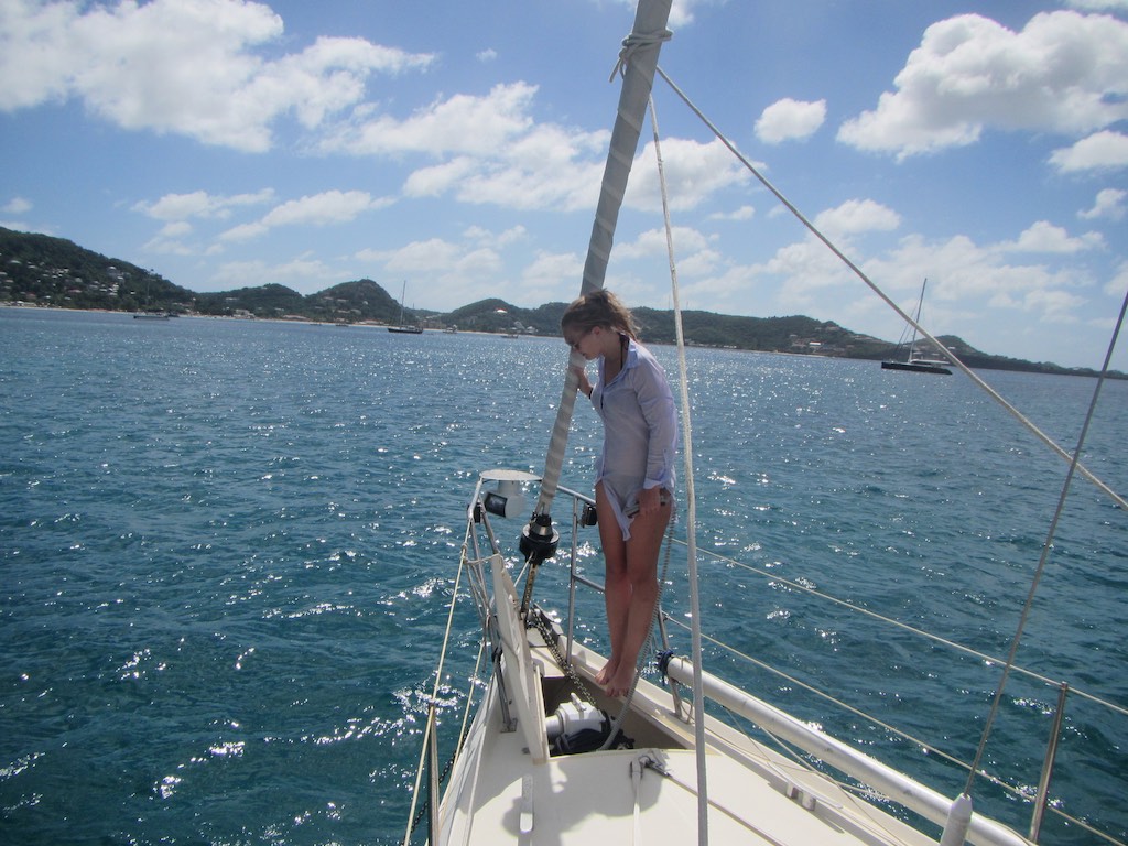 Die Girls legen schon kurz nach dem Fahrwasser von LePhareBleu selber Hand an. Mit etwas Genua steuern sie in Richtung Landsend von Grenada.