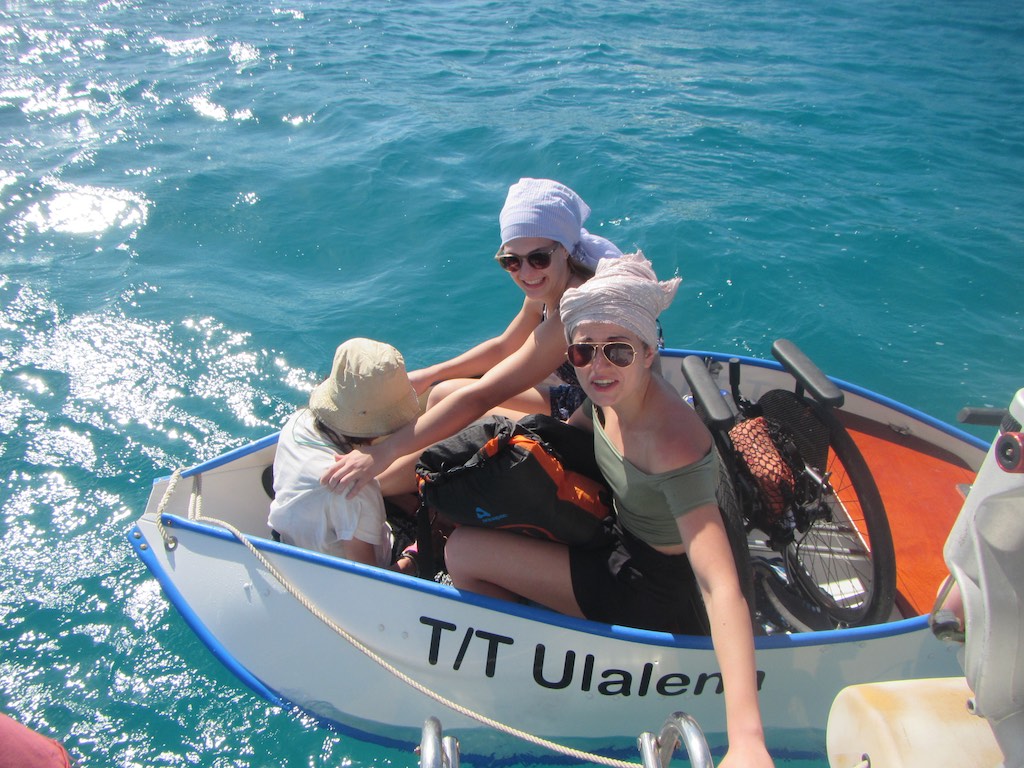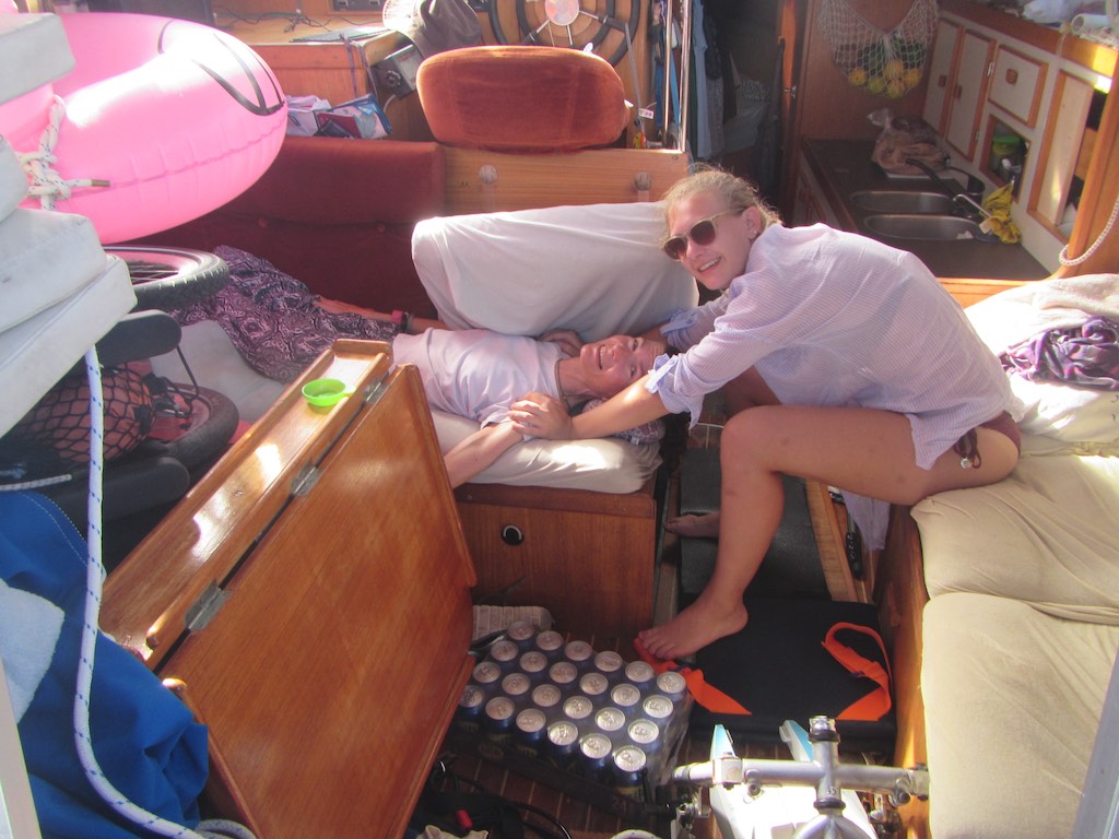 Wenn ich eine grössere Welle nicht richtig abfangen kann, schlagen wir etwas Quer und sie rutscht durchs ganze Boot. Jenny und Jasmin sichern sie so gut es geht.
