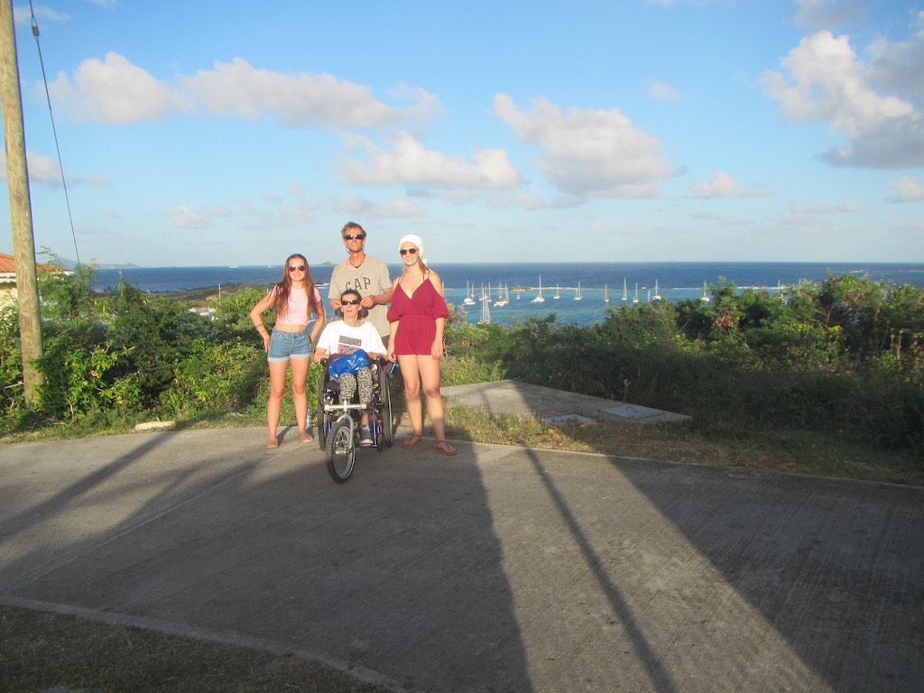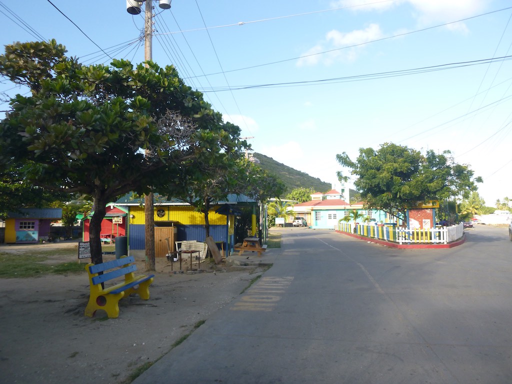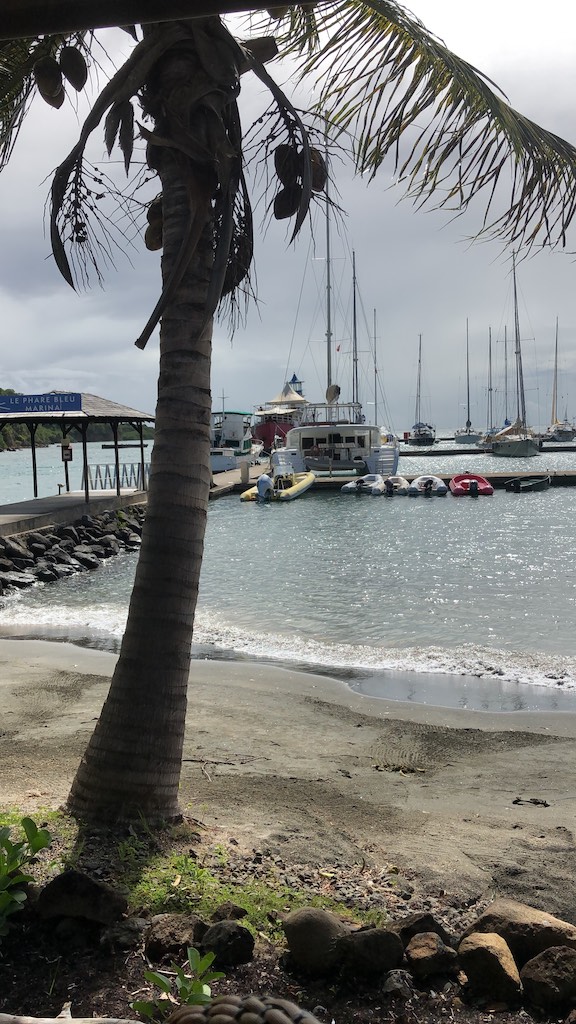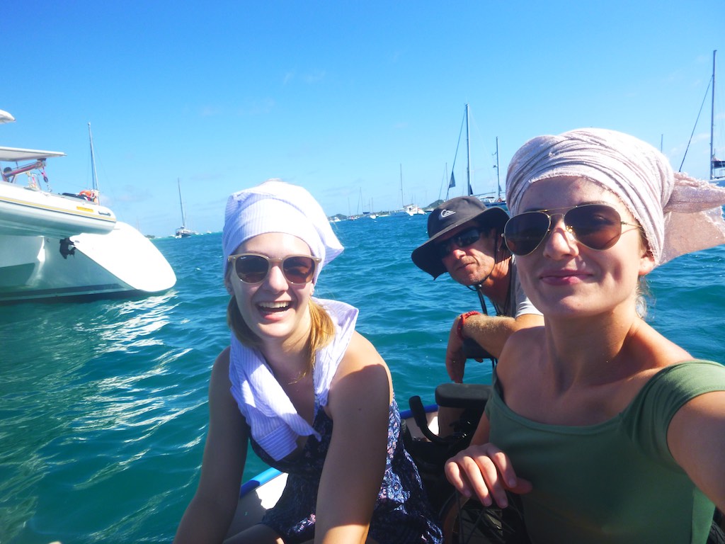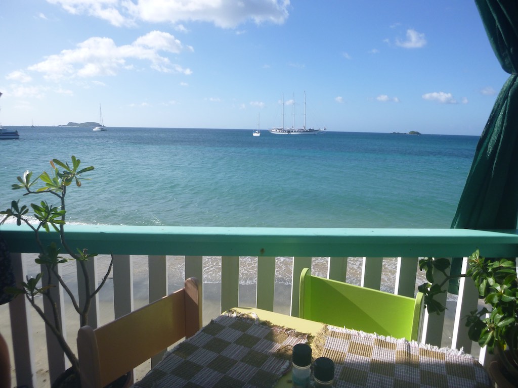 Anker runter und die Banane zu Wasser lassen. Das Dingi haben wir neu unter dem Baum platziert und müssen es so nicht nachziehen, wie alles Charterboot es so machen, oder müssen es nicht immer zerlegen. Praktisch. Jasmin ans Steuer, der Motor spukt schon wieder, und endlich läuft er und wir setzten zum Steg, oder besser zuerst in den Sand über. Ab in das wirklich schöne Dorf. Die Behörden sind schnell gefunden und das bekannte Formular schnell ausgefüllt. Bei der Frage, wer fliegt den von Grenada weg, muss ich kurz die Mädels um Mithilfe bitten. Fertig. Alles klar und so haben wir nun genug Zeit, uns das Dorf, also die Hauptstrasse, anzusehen. Im nahen Supermarkt kaufen wir die letzte Sachen ein und sehen auch schon eine Super Beiz für uns. Das Kayak ist einfach himmlisch! Diese Aussicht, direkt auf unser kleines Ding.