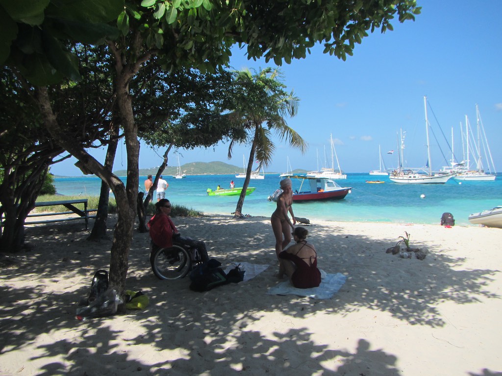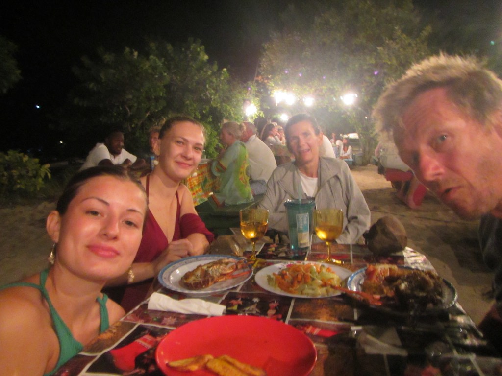 Bald kommt ein Boot zu uns und fragt nach einem Langusten-Dinner. Au, ja! Wann den? Heute? Morgen? Wir einigen uns mit Teddy für Heute und bestellen einen Tisch für vier. Es holt uns sogar ab. Super Service! Fast pünktlich, zwar etwas irritiert wegen des Stuhls, bringt er uns an den schönen Strand. Alles trocken und Gaby wird im Stuhl durch den Sand geschoben. Unser Tisch ist mitten drin. Um die Getränke mussten wir uns selber bemühen. Gläser auf den Tisch und kühlen Wein von Spanien einschenken. Prost! Teddy bringt uns schon bald die feinen Sachen. Reis, Gemüse, Bananen, Kartoffeln, einen feinen Fisch für Gaby und natürlich die Langusten.