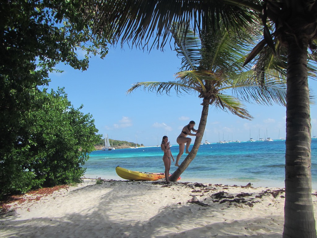 Trotz der vielen Leute recht gediegen hier. Ich schau mich kurz um und finde auf der anderen Seite der Insel einen wunderschönen Strand. Keiner da, also ab auf die Südseite. Auf die Palme müssen wir nicht unbedingt, versuchen es aber trotzdem.