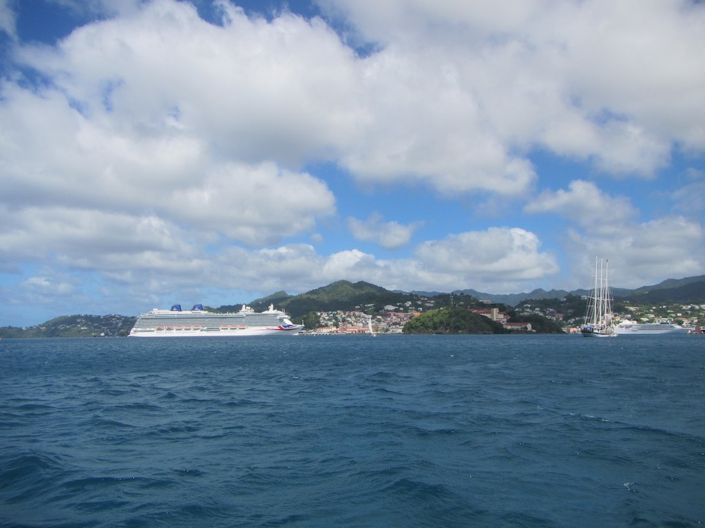 Ist ja bald vorbei mit der Schauklerei. Kurz nach dem Felsen Kick em Jenny ist es etwas ruhiger und erst recht als wir nach drei Stunden Grenada querab haben. Dann wird es gemütlich und kurz vor St. George’s fällt der Wind sogar ganz zusammen. Wir durchqueren den Kanal zur Hauptstadt und sehen schon von weitem die übergrossen Pötte stehen. Verrückt wie gross die sind!