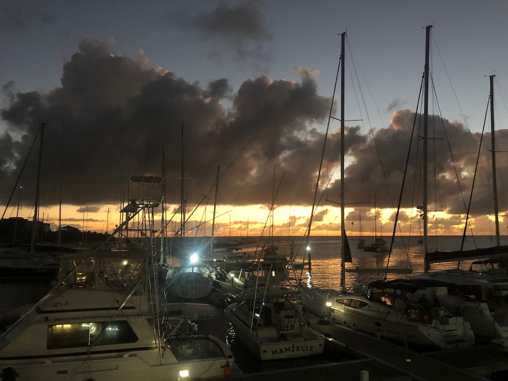 Guter Kaffee und schnelles WiFi, wir sind fast selig 😉 Am Abend setzen wir uns schon bald in die zweite Etage und geniessen die traumhafte Sicht auf die Marina und die untergehende Sonne.
