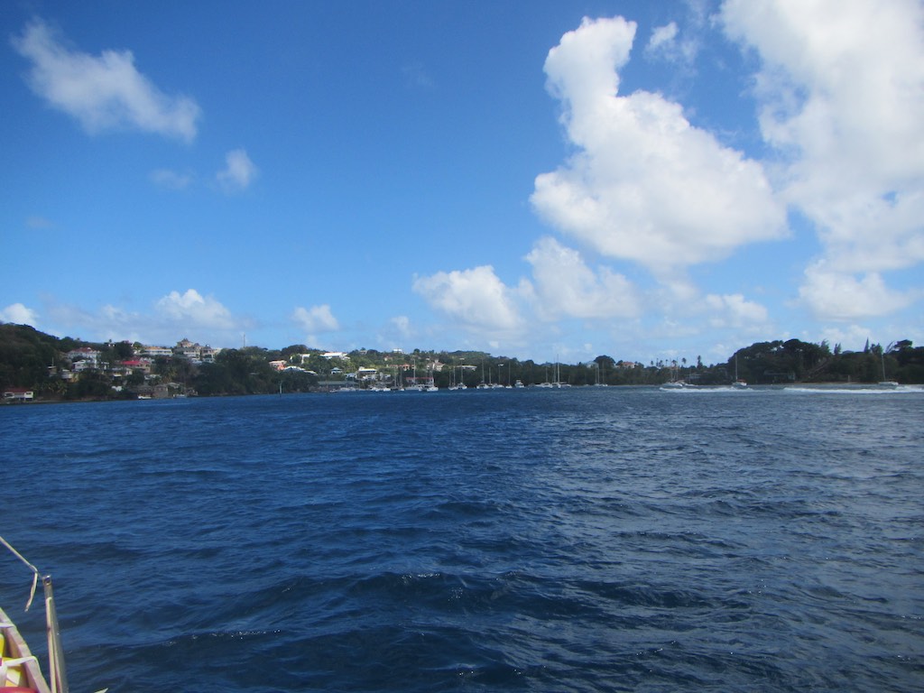 Am nächsten Tag ist mal wieder viel Arbeit angesagt. Zuerst ein kurzer Spaziergang in die nahe Stadt. Calliaqua ist nur über den Highway zu erreichen. Kann ja nicht so schlimm sein. Doch ist es. Alle kommen mit Vollgas ums Eck und wir müssen fast auf die Seite flüchten. Etwas Brot, Gemüse und Früchte, dann rollen wir auf der gefährlichen Strecke zurück zur Marina. Dazwischen erhaschen wir die Aussicht auf die Lagune. Der offizielle Eingang rechts, das brechende Riff und der gefährlichen Südeingang.