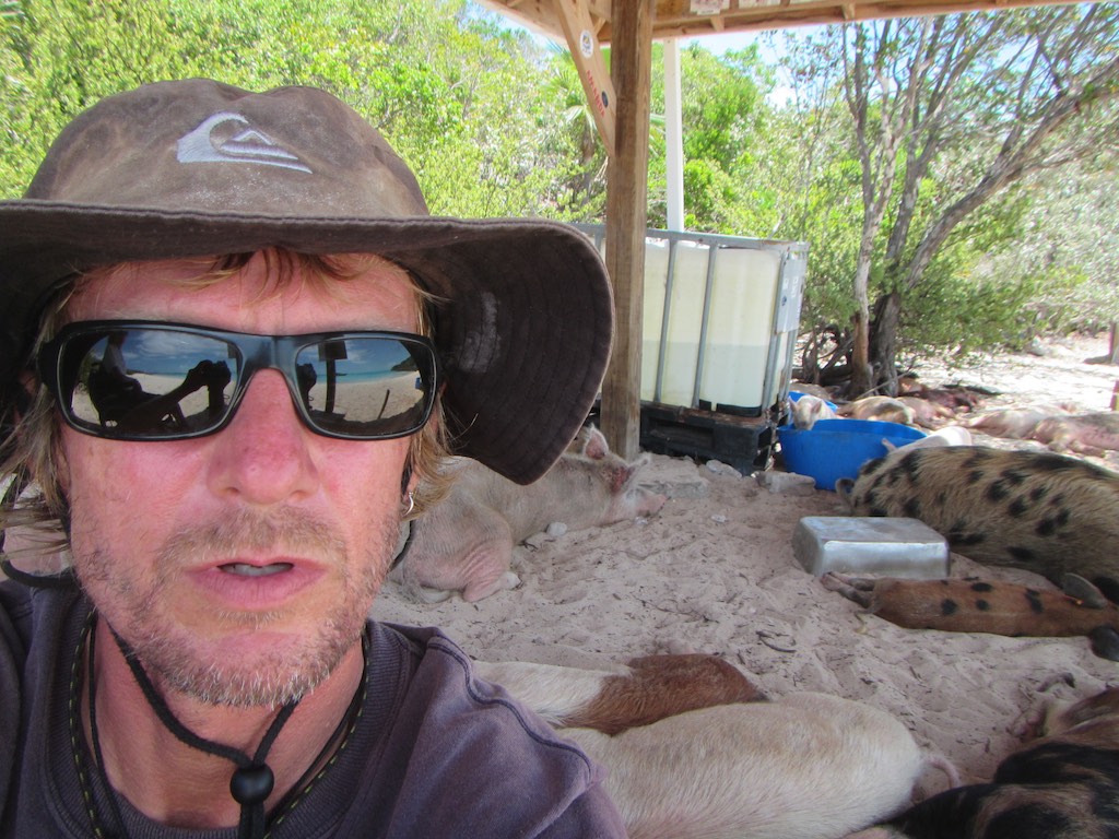 Dann zeihen wir los. Rudern an Land und sehen schon das Malheur – die Touris trauen sich nicht in die Nähe! Sie füttern sie aus den “sicheren” Booten und so kommen die Schweine zu einem Bad.