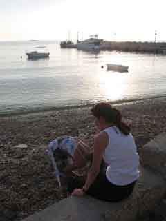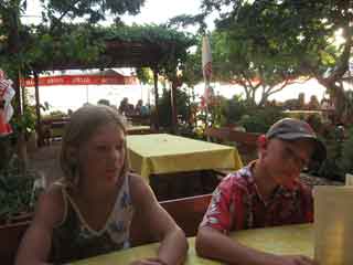 Wie im Bilderbuch. Also schnell den Anker runter und baden. Sogar die Ankerwinsch funktioniert wieder. Gut, sehr gut. Am Abend gehen wir aus. Alle schmeissen sich in die besten Klamotten. Das Dingi macht sich auch fit und bekommt zum ersten Mal den Motor abgehängt. Joel startet ihn, aber er stellt wieder ab, als der Choke raus ist. Also braucht er ihn. Nun machen wir Fahrdienst. Zuerst Jasmin mit dem Rollstuhl und dann Gaby. Alles gut angekommen. Nur noch die Schuhe montieren.