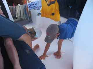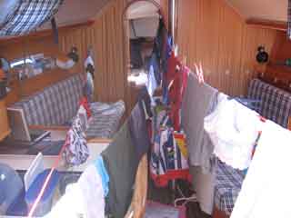 Bei der “Überfahrt” nach Olib hatten wir schnell Langeweile. Der Wind säuselte vor sich her und reichte nicht recht zum segeln. Also alles Tuch hoch und noch den Motor zum schieben. Und jetzt? Gaby hatte eine super Idee, Wäsche waschen. Okay machen wir. Aber wie? Ach so in der Pütz (Eimer). Also Jasmin, Wäsche holen, etwas Waschmittel und Süsswasser und dann nur noch kneten. So jetzt ein Leine spannen und alles aufhängen.