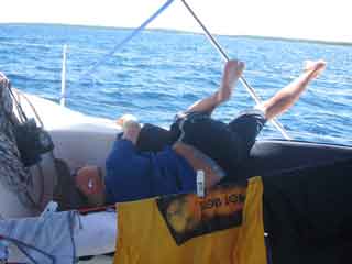 Nochmals von vorne. Der erste Anker hält nun, aber wir sind etwas nahe am Ufer. Wir machen den zweiten bereit. Es ist eine grausame Unruhe auf der Kristina. Alle schlagen um sich, denn es hat unzählige Wespen um uns. Gaby hat schon zwei Stiche und die Kids flippen fast aus. Nun das Dingi raus, aufblasen und rauswerfen. Cool, leider dreht sich das Unding und die Paddel fliegen ins Wasser. Joel hinterher, kann aber leider nur noch eines retten. Also muss der Motor ran. Motor anschliessen, Anker rein und die Kette hinterher. Kurz noch die Leine anknöpfen und los geht’s. Die Kids kommen recht weit, leider ist die Leine alle und auch die Kette ist schon versenkt. Sie würgen und machen, aber es gelingt ihnen nicht, den Anker um einen Stein zu legen. Was jetzt, Badehose an und rausschwimmen. Kette nachziehen und um den Stein zu legen. Geschafft. Retour zum Boot und anziehen. Sitzt, aber immer noch diese lästigen Biester. Gaby hat mittlerweile sieben Stiche und auch Joel hat eine erwischt. Unterdessen suchen Jasmin und ich nach dem Paddel. Da ist es! Schreit sie endlich. Viel zu tief für sie, also wieder ins Wasser und tauchen. So alles paletti. Fast, wenn nur nicht diese Viecher wären. Joel hat sich in der Koje eingeschlossen und Jasmin springt in der Kabine umher. So kann’s ja nicht gehen. Auch wenn wir wissen, dass die Dinger bei Sonnenuntergang verschwinden ist das keine Lösung. Jasmin rechnet, es dauert noch 3 Stunden. Nein wir gehen wieder. Schade.