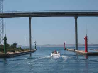 Wo ist die nächste schöne Bucht? 5-10 Meilen hats zwei, drei schöne. So müssen wir nur noch unter der Brücke durch. Ja genau die beiden Inseln Ugljan und Pasman verbindet eine 16.50 Meter hohe Brücke. Laut unseren Papieren schauen wir ca. 15 Meter aus dem Wasser. Sollte reichen. Der Kanal mit der Brücke kommt immer näher und wird immer kleiner.