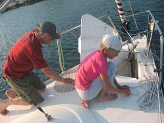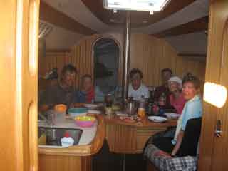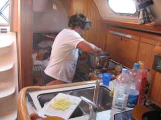 Segeln gibt mächtig Hunger! Oma kann es kaum erwarten und stürzt sich in die Küche. Reis mit Peperoni und Erbsen, dazu Tomatensalat ist auf dem Program.