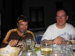 So jetzt ist es aber Zeit zum Essen. Der Regen wird immer stärker und so rennen wir die engen Gassen hinunter. Mit Stufen und diesen holprigen Steinen ist es nicht so einfach, das Gaby im Rollstuhl bleibt. Da kommt plötzlich eine Frau aus einem Laden und sagt: “Da, gleiche Strasse, aber Flach” Okay, folgen wir dieser. Aber ein halber Bach geht diese Gasse hinunter und es wird sehr schliferig. Rick hat mit seinen Sawannenhuscher die liebe mühe, nicht um zufallen oder auszurutschen. Einmal links, dann wieder rechts, bis wir auf der anderen Seite wieder am Meer unten sind. Ganz nass setzten wir uns ins Ancora. Unter den Sonnenschirmen ist’s ganz gemütlich und wir schlemmen wieder los.