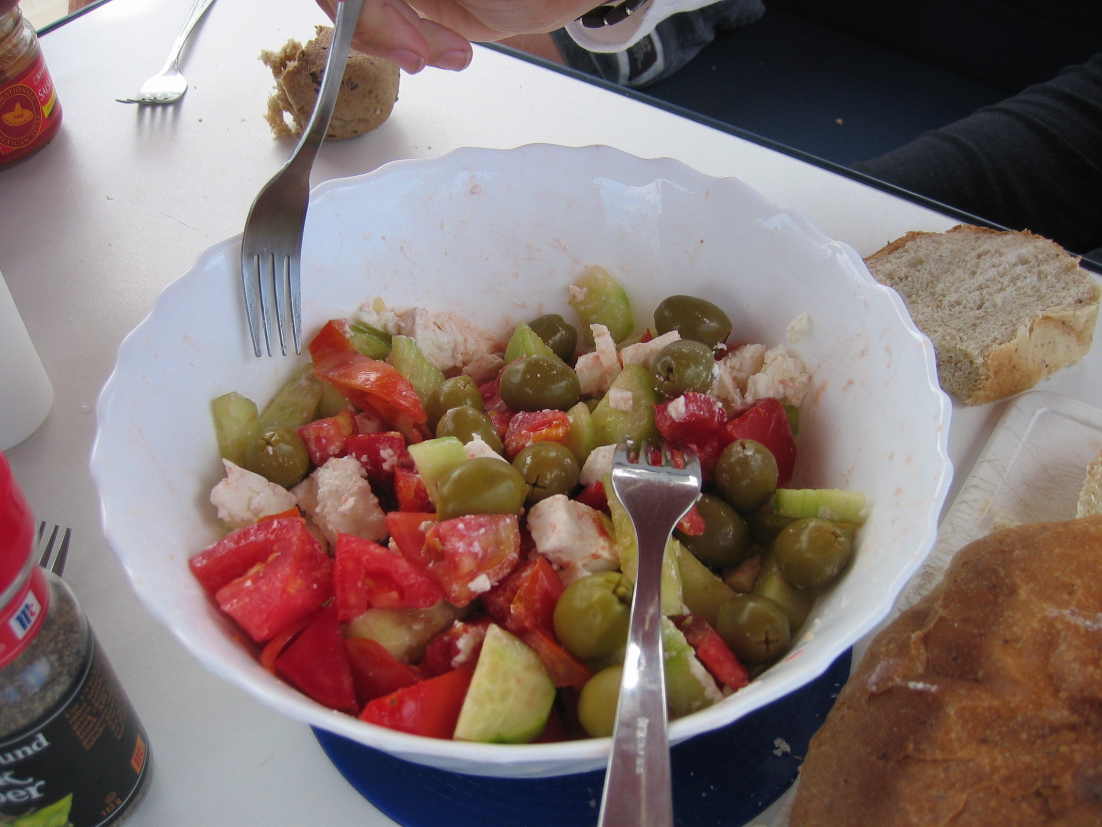 Hunger, Hunger, Hunger! Machen wir einen griechischen Salat? Au ja, das währe was. Rick, willst du? Okay. Und er zaubert einen super Salat in die Schüssel. Mit etwas Gewürz, sensationell!