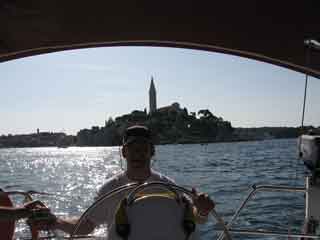 Das ist ein Zmorge! Dani holt für uns wieder Brötchen. Diesmal aber die vom richtigen Beck. Dunkle mit Körner auf dem Brot. Man gewöhnt sich fast daran. Dann ist Dani daran, rauszufahren. Alle Leinen los und raus geht’s. Als wir am lösen der Bojen-Leine sind, sagt unser Kompliziert-Hoch-Drei-Nachbar, wir müssen keine Angst haben, er fahre auch nur etwas vor. Wir haben uns augenblicklich alle angeschaut und los gelacht. So hatte Dani seine erste “Prüfung” bestanden und wir segelten ab Richtung Novigrad an einem grossen Pott vorbei.