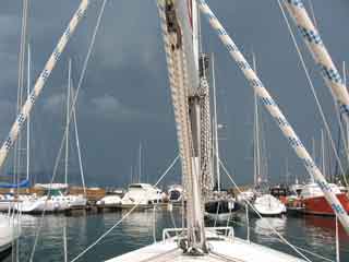 Gewaltig wie das schüttet! Wir müssen sogar den Niedergang zumachen, damit es nicht rein stürmt. Ich kann das fast nicht glauben, was da abgeht und dann dass noch. Ich sehe nur noch einen Masten eines Seglers in den Hafen einfahren und in Richtung unseren Steges kommen. Soll ich jetzt raus? Zum Glück sind aber schon die Marinerios vor Ort und helfen dem armen Teufel. Wahnsinn, was macht man bei diesem Wetter noch auf dem Meer?