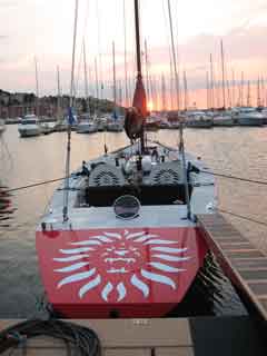 Am Abend müssen wir dann aber trotzdem nochmals raus. Den ganzen Tag im Keller schlägt einem schon etwas aufs Gemüt. Wir wollen gar nicht weit. Ins Al Porto eine Pizza essen währe doch was. Gaby hatte gestern die letzten drei Seiten der Speisekarte gar nicht angeschaut und nicht bemerkt, dass es auch Pizzas gibt. Also umrundeten wir die Marina und verzogen uns ins Restaurant. Auf dem Weg sahen wir noch eine super Renngeiss, die auch Heute noch eingelaufen war. Was für ein Ding!