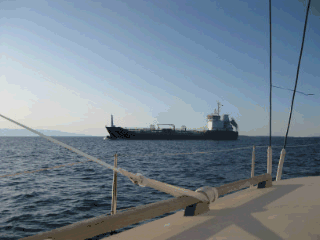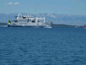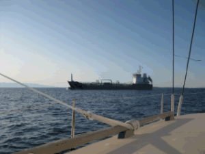 Ilovik war wirklich schön. Auf einmal taucht dieser Brocken auf. Wie war das wieder? Wer ist schneller oder sind wir auf Kollision? Er kommt wirklich nahe, aber es reicht.
